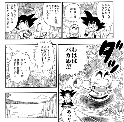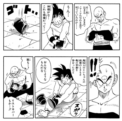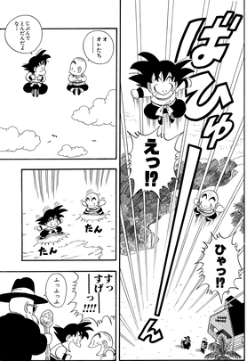 Ikezaki:Otra gran parte es más adelante, después de que Goku y Krillin hayan completado su entrenamiento y descubran que ahora pueden saltar asombrosamente alto. Fue muy emocionante leerlo mientras crecía, y recuerdo haber pensado: "¡Vaya, entrenar se ve increíble!".