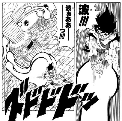 Ikezaki: También me encanta la parte de la historia en la que Goku entrena en la Gravity Room de su nave espacial mientras viaja al Planet Namek. Dispara una andanada de Kamehamehas y deliberadamente los lanza de frente para empujarse al borde de la muerte, luego se recupera con un Senzu Bean para volverse aún más fuerte. No recuerdo haber visto cosas exageradas como esa en ningún manga que no sea Dragon Ball.