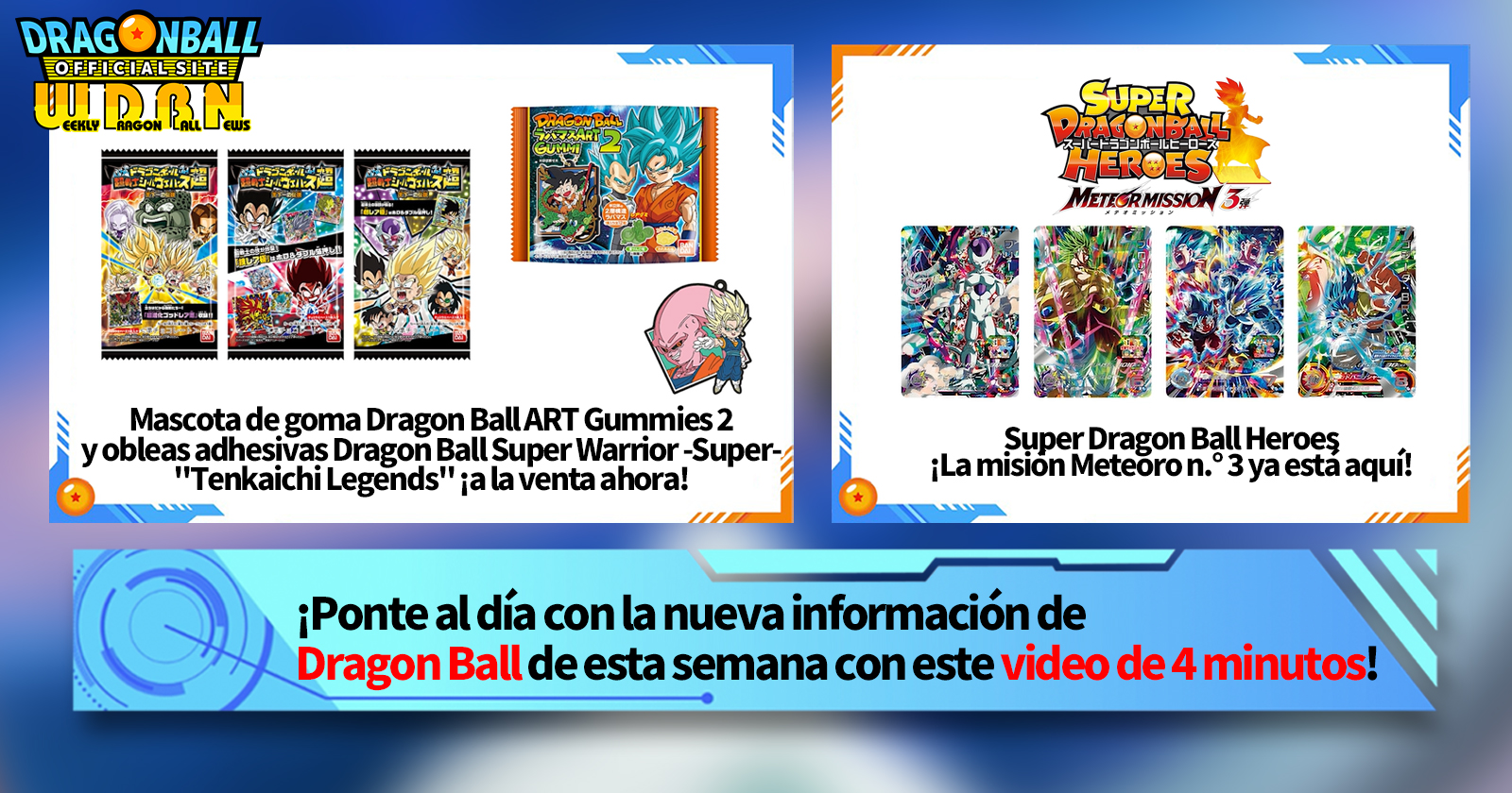 La transmisión de esta semana tiene información exclusiva sobre Dragon Ball Rubber Mascot ART Gummies 2 y Dragon Ball Super Warrior Sticker Wafers -Super-: Tenkaichi Legends. Estas dos novedades salieron a la venta el 4 y 11 de marzo respectivamente.