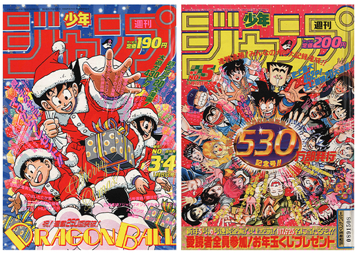 Goku continuó apareciendo en las portadas de Shonen Jump, como aquí a la izquierda, donde ayudó a celebrar la Navidad con un traje de Papá Noel, o a la derecha, donde apareció el Saiyajin en el centro para celebrar las 5,3 millones de copias vendidas de la revista.
