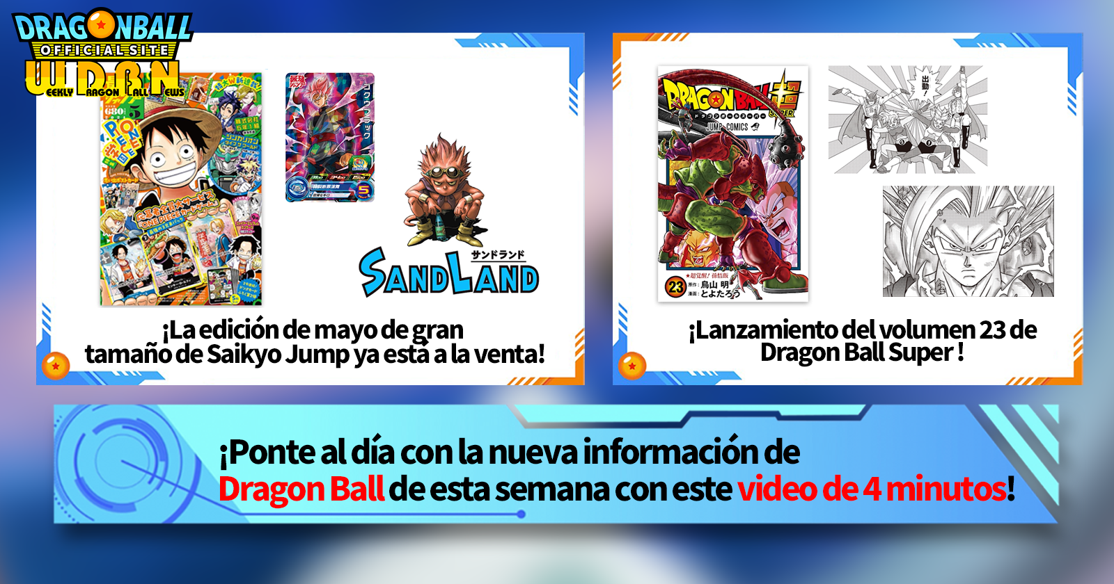 "Noticias semanales de Dragon Ball" es una serie de videos que se actualiza todos los lunes (JST) para brindarte las últimas noticias en el mundo de Dragon Ball. Únase al editor de V Jump, Victory Uchida, mientras cubre toda la información más reciente publicada la semana anterior, así como nuevas actualizaciones como información de nuevos productos y noticias del sitio para la próxima semana.