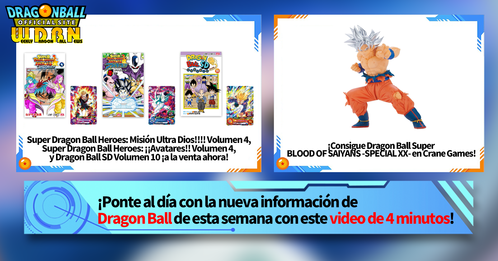 "Noticias semanales de Dragon Ball" es una serie de videos que se actualiza todos los lunes (JST) para brindarte las últimas noticias en el mundo de Dragon Ball. Únase al editor de V Jump, Victory Uchida, mientras cubre toda la información más reciente publicada la semana anterior, así como nuevas actualizaciones como información de nuevos productos y noticias del sitio para la próxima semana.