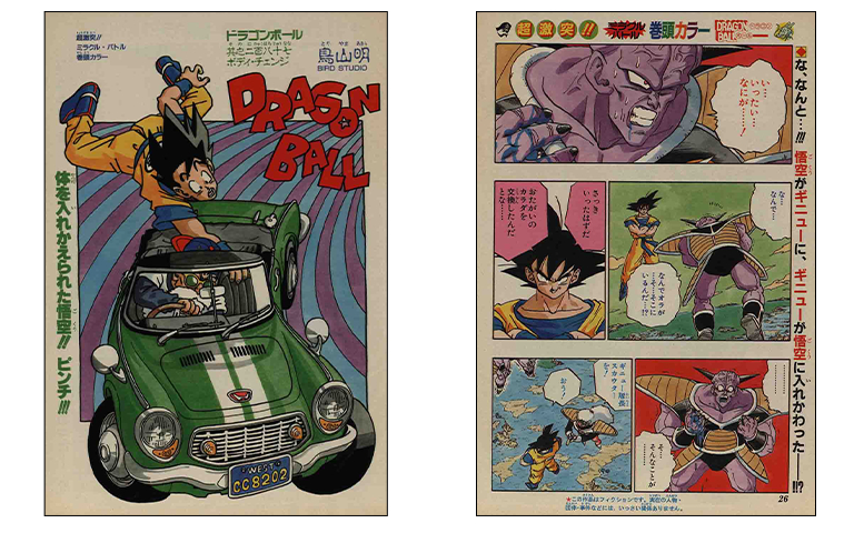 ¡De vuelta en el manga, la batalla de Goku con Ginyu dio un giro impactante cuando el líder morado de la Fuerza Ginyu intercambió cuerpos con nuestro protagonista! Los resultados de la increíble técnica Body Change de Ginyu incluso se presentaron en colores vibrantes.