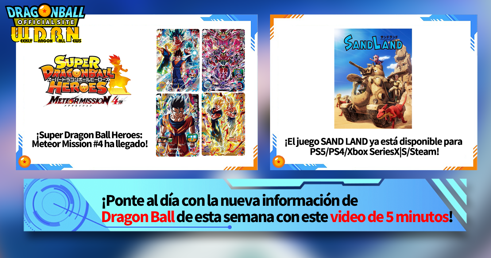 "Noticias semanales de Dragon Ball" es una serie de videos que se actualiza todos los lunes (JST) para brindarte las últimas noticias en el mundo de Dragon Ball. Únase al editor de V Jump, Victory Uchida, mientras cubre toda la información más reciente publicada la semana anterior, así como nuevas actualizaciones como información de nuevos productos y noticias del sitio para la próxima semana.
