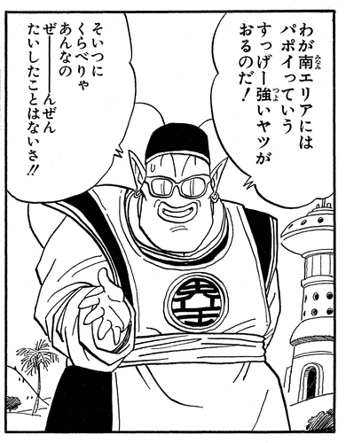 Al escuchar a South Kai alardear y fanfarronear de que "¡En los planetas del sur hay un luchador poderoso llamado Papoye! ¡¡Se comerá a este tipo en el desayuno!!", Kai del Norte sugiere aumentar el peso de entrenamiento de Goku.