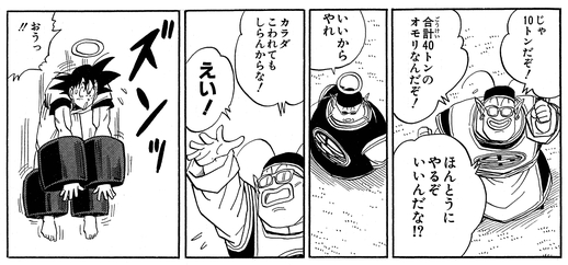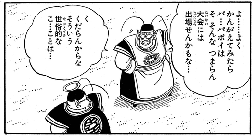 Aunque South Kai había estado sumamente seguro de que Papoye podría llevarse la victoria fácilmente, cambia de opinión después de ver a Goku manejar 40 toneladas de pesas como si no fuera nada. Conmocionado, South Kai tartamudea: "S-Claro... ¡Aunque probablemente ni siquiera se molestará en ir!"