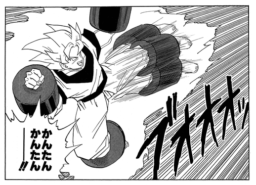Al ver a Goku transformarse en Super Saiyan y continuar entrenando cargando un total de 40 toneladas sin siquiera sudar, South Kai se queda sin palabras.
