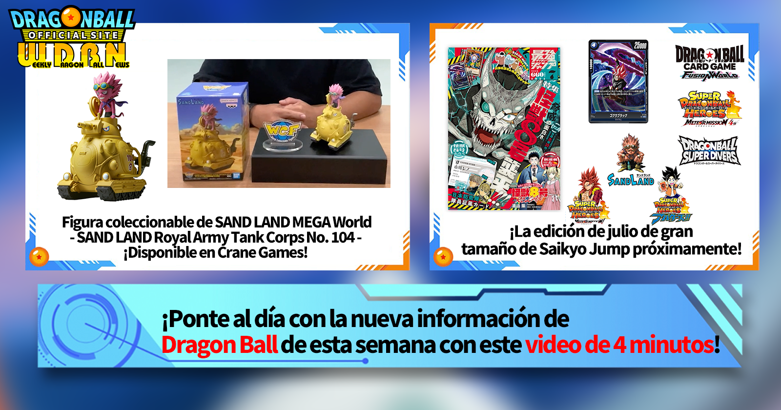 "Noticias semanales de Dragon Ball" es una serie de videos que se actualiza todos los lunes (JST) para brindarte las últimas noticias en el mundo de Dragon Ball. Únase al editor de V Jump, Victory Uchida, mientras cubre toda la información más reciente publicada la semana anterior, así como nuevas actualizaciones como información de nuevos productos y noticias del sitio para la próxima semana.