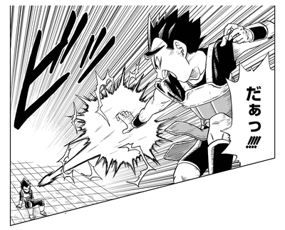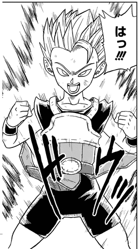 Cabba alcanza su forma de Super Saiyan en su partido del torneo contra Vegeta, quien le muestra que la rabia es la clave para la transformación.