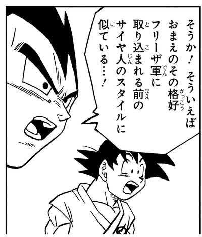 Vegeta comenta que el traje de batalla de Cabba se parece a la armadura de Saiyan en los días anteriores a la Fuerza de Freezer.