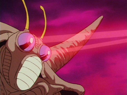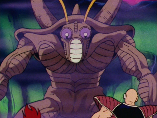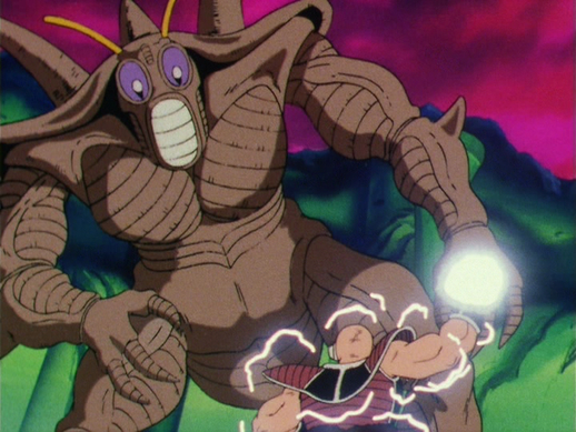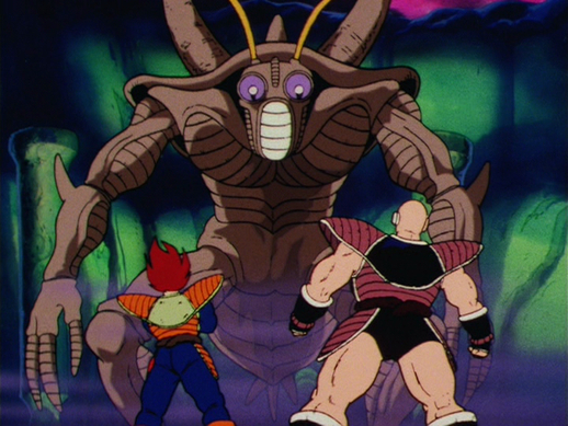 El insectoide se acerca a Nappa, pero el Saiyajin no tiene problemas para esquivar sus ágiles ataques. Yeddy también dispara rayos desde sus ojos hacia Vegeta, que el príncipe zigzaguea sin esfuerzo para evadir.