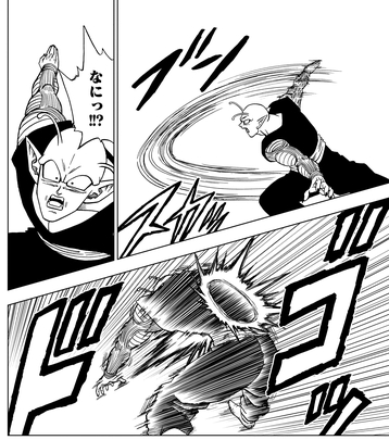 Piccolo siente a su pequeño oponente y ataca al guerrero aparentemente invisible, pero Damon lo esquiva y contraataca con un golpe que saca al Namekian fuera de los límites.