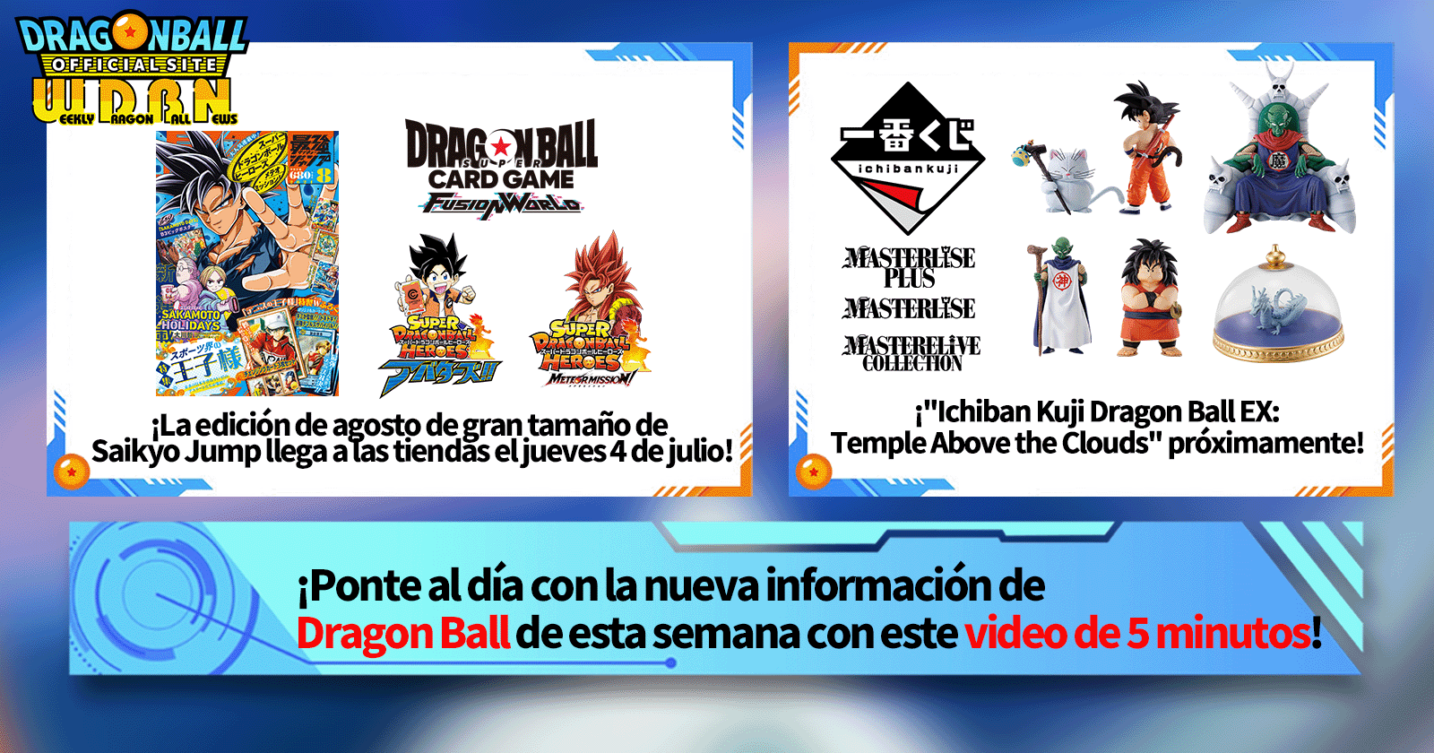"Noticias semanales de Dragon Ball" es una serie de videos que se actualiza todos los lunes (JST) para brindarte las últimas noticias en el mundo de Dragon Ball. Únase al editor de V Jump, Victory Uchida, mientras cubre toda la información más reciente publicada la semana anterior, así como nuevas actualizaciones como información de nuevos productos y noticias del sitio para la próxima semana.
