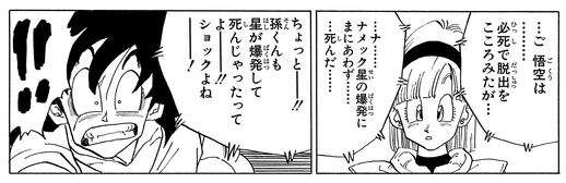 Tras la destrucción del Planet Namek, no queda claro qué le pasó a Goku, que había quedado atrapado directamente en la explosión. Una vez más, usando la telepatía de North Kai, Yamcha se comunica con Bulma en la Tierra y comienza a contarle lo que sucedió, pero se molesta mucho por la manera frívola en la que Bulma transmite la información a todos los que están allí.