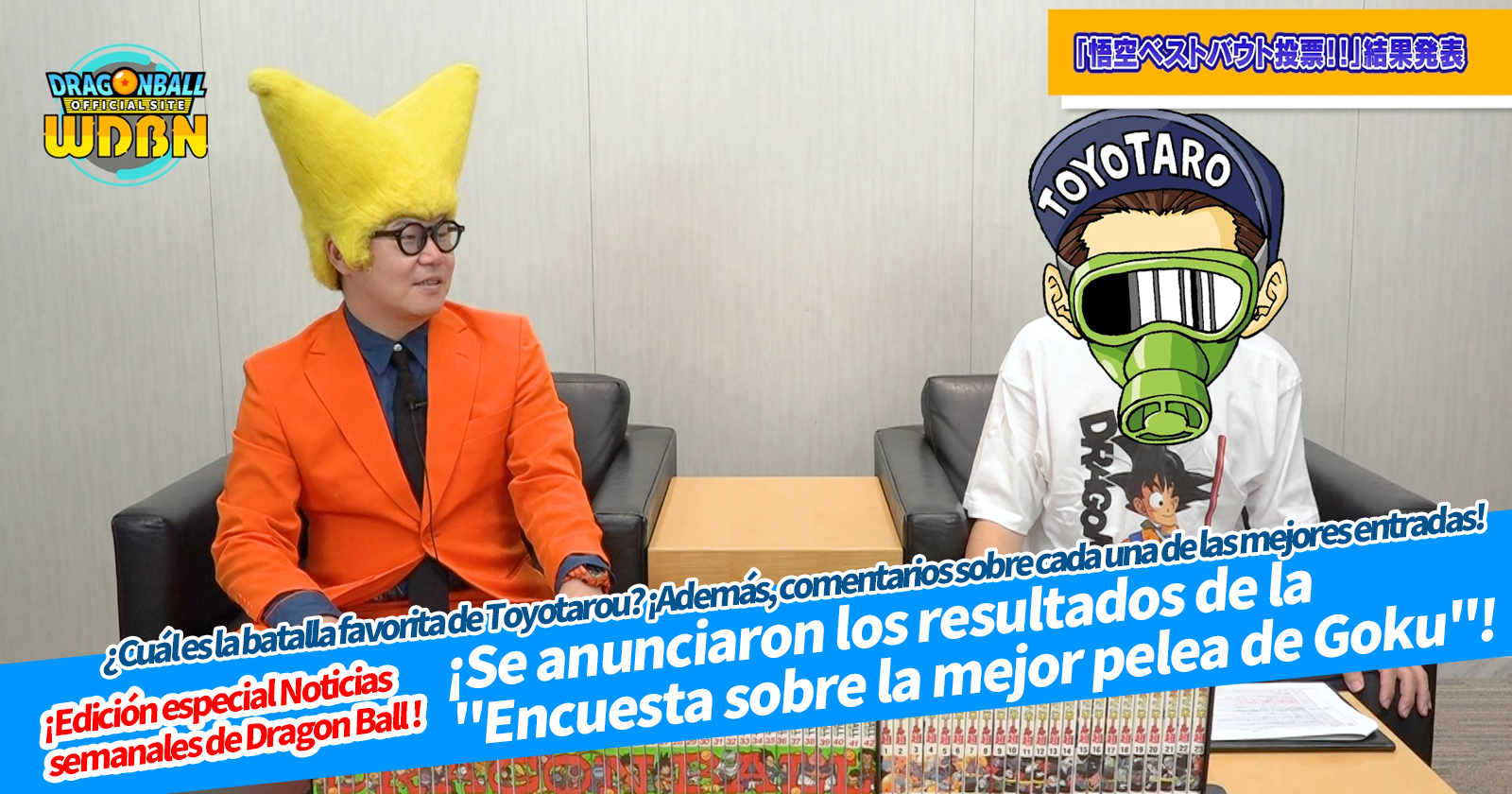 "Noticias semanales de Dragon Ball" es una serie de videos que se actualiza todos los lunes (JST) para brindarte las últimas noticias del mundo de Dragon Ball. El programa de esta semana es una transmisión especial que anuncia los resultados de la encuesta Goku's Best Bout Votación que se realizó este año el 9 de mayo, más formalmente conocida como Goku Day.
