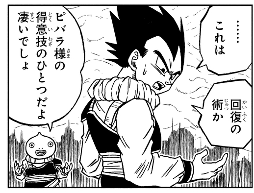 Vegeta estaba exhausto por el entrenamiento, por lo que Pybara usa su técnica de curación para curar al Saiyajin. Pero según Pybara, esas artes curativas son de alto nivel y, por lo tanto, comienzan por enseñarle a Vegeta la habilidad más fundamental, la Teleportation Instantánea.