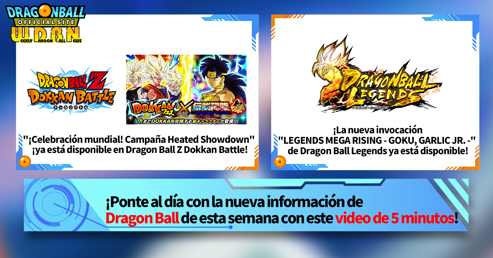 "Noticias semanales de Dragon Ball" es una serie de videos que se actualiza todos los lunes (JST) para brindarte las últimas noticias del mundo de Dragon Ball. ¡Únete al editor de V Jump, Victory Uchida, mientras cubre toda la información más reciente publicada la semana anterior, así como actualizaciones nuevas como información sobre nuevos productos y noticias del sitio para la semana que viene!