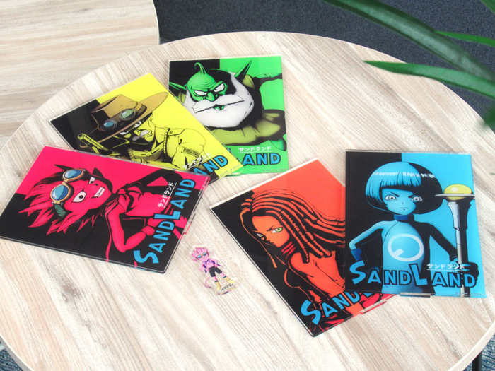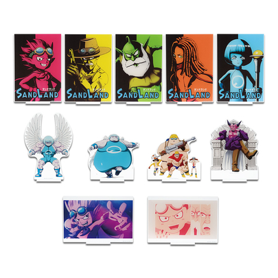 ¡Y eso no es todo! ¡Hay disponibles grandes stands acrílicos de los Nadadores y Satanás, pósteres de tela con diseños superlindos o increíblemente geniales y una colección de postales históricas increíblemente completa! ¡Todos los artículos de este set seguramente complacerán a los fanáticos de SAND LAND: THE SERIES!