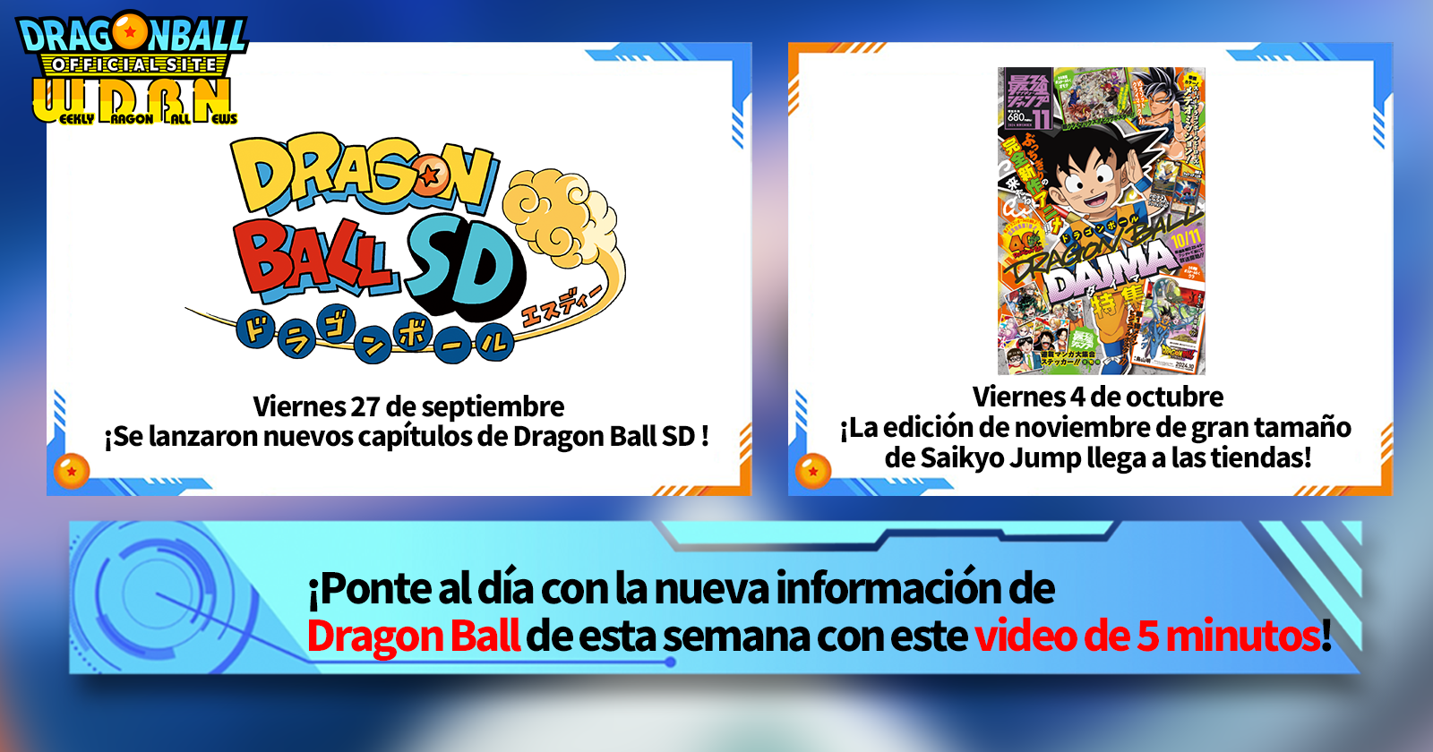 "Noticias semanales de Dragon Ball" es una serie de videos que se actualiza todos los lunes (JST) para brindarte las últimas noticias del mundo de Dragon Ball. ¡Únete al editor de V Jump, Victor Uchida, mientras cubre toda la información más reciente publicada la semana anterior, así como actualizaciones nuevas como información sobre nuevos productos y noticias del sitio para la semana que viene!