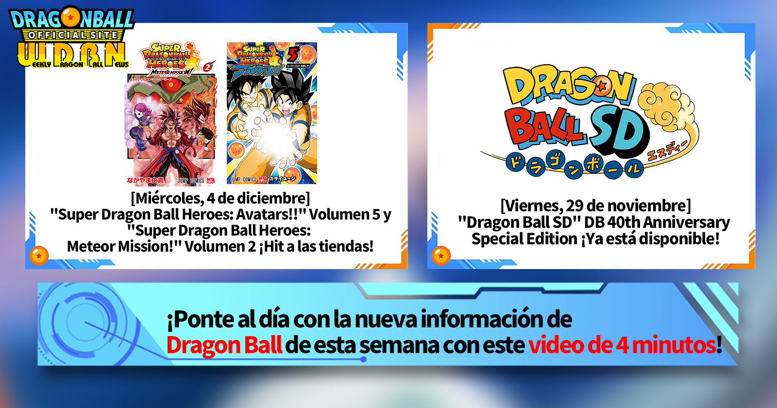 "Noticias semanales de Dragon Ball" es una serie de videos que se actualiza todos los lunes (JST) para brindarte las últimas noticias del mundo de Dragon Ball. ¡Únete al editor de V Jump, Victor Uchida, mientras cubre toda la información más reciente publicada la semana anterior, así como actualizaciones nuevas como información sobre nuevos productos y noticias del sitio para la semana que viene!