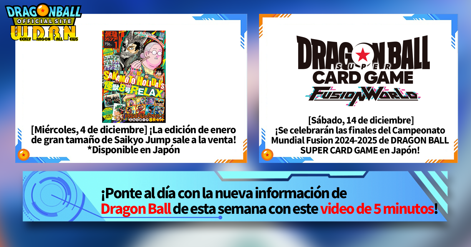 "Noticias semanales de Dragon Ball" es una serie de videos que se actualiza todos los lunes (JST) para brindarte las últimas noticias del mundo de Dragon Ball. ¡Únete al editor de V Jump, Victor Uchida, mientras cubre toda la información más reciente publicada la semana anterior, así como actualizaciones nuevas como información sobre nuevos productos y noticias del sitio para la semana que viene!