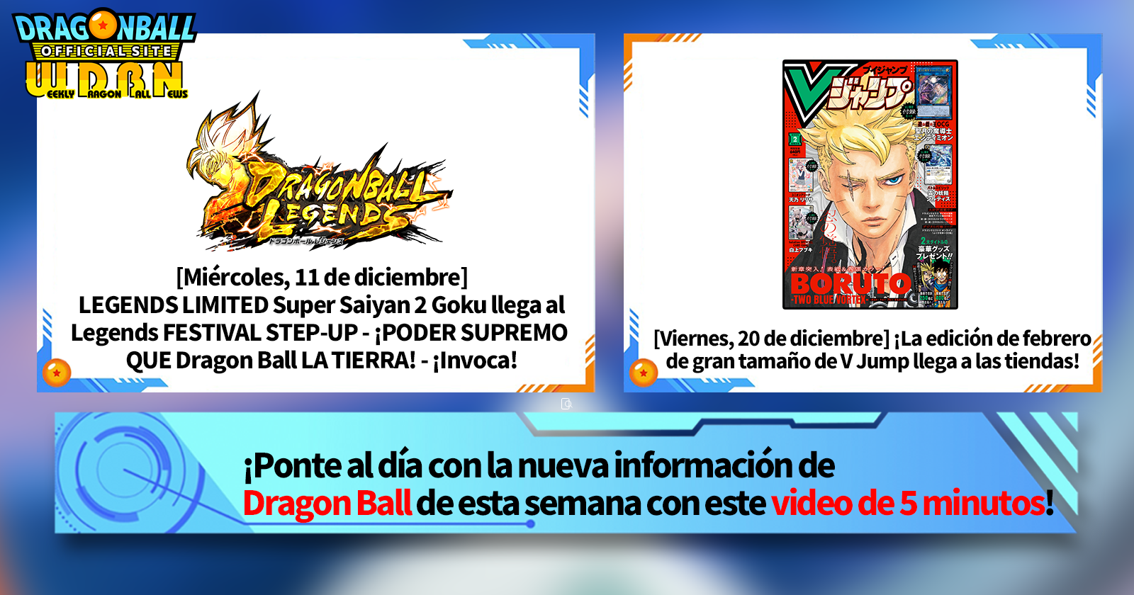 "Noticias semanales de Dragon Ball" es una serie de videos que se actualiza todos los lunes (JST) para brindarte las últimas noticias del mundo de Dragon Ball. ¡Únete al editor de V Jump, Victor Uchida, mientras cubre toda la información más reciente publicada la semana anterior, así como actualizaciones nuevas como información sobre nuevos productos y noticias del sitio para la semana que viene!
