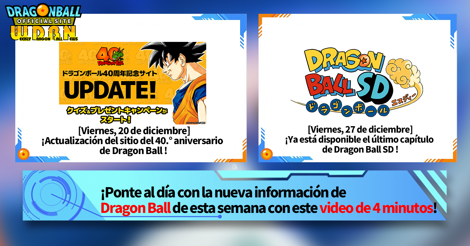 "Noticias semanales de Dragon Ball" es una serie de videos que se actualiza todos los lunes (JST) para brindarte las últimas noticias del mundo de Dragon Ball. ¡Únete al editor de V Jump, Victor Uchida, mientras cubre toda la información más reciente publicada la semana anterior, así como actualizaciones nuevas como información sobre nuevos productos y noticias del sitio para la semana que viene!