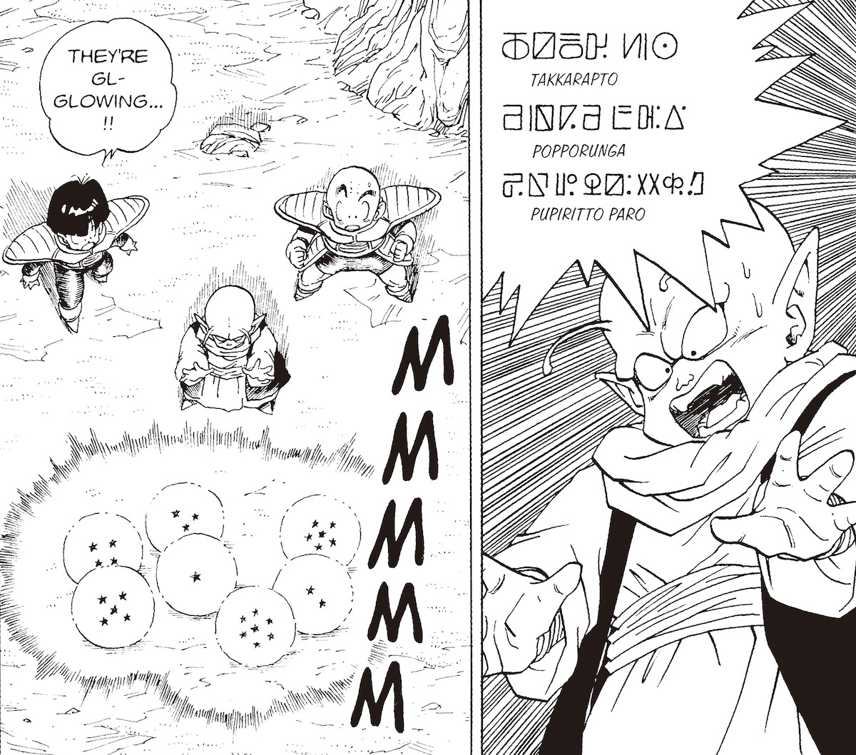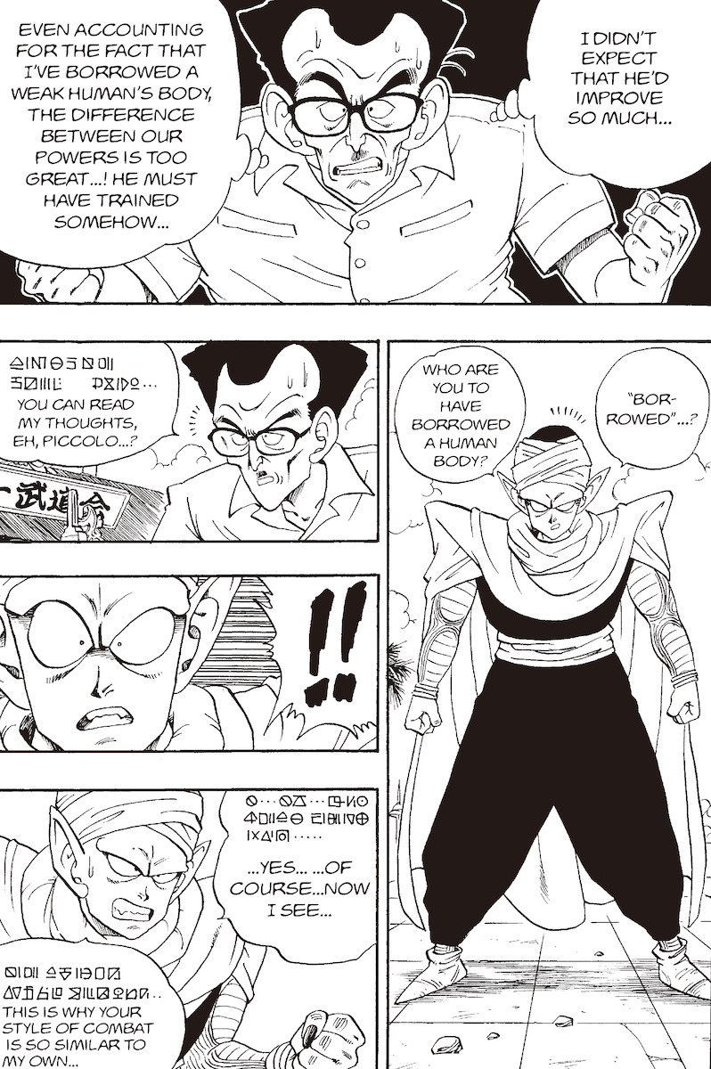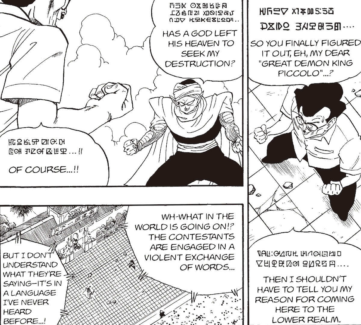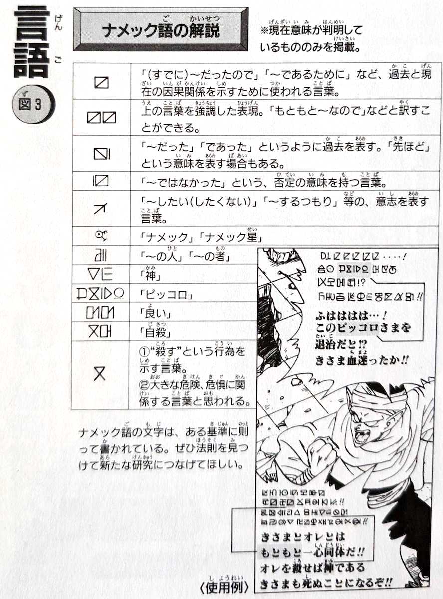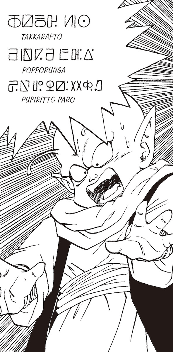Mientras tanto, en términos de Namekian, palabras como el nombre de Piccolo se expresan en cuatro caracteres, al igual que en japonés, y me imagino que eso se hizo a propósito. De esta manera, Akira Toriyama estableció un equilibrio entre crear un lenguaje en el que los lectores puedan pensar profundamente, ya que no es un lenguaje creado al azar, y al mismo tiempo hacerlo lo suficientemente conciso para que funcione bien en un formato de revista semanal. Eso es realmente asombroso.