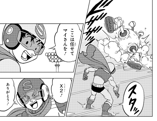 Con la aparición de Beta 2, un androide con chaqueta de batalla, Goten se transforma en Saiyaman X-2. ¡Luego, los dos jóvenes héroes superan a los atacantes!