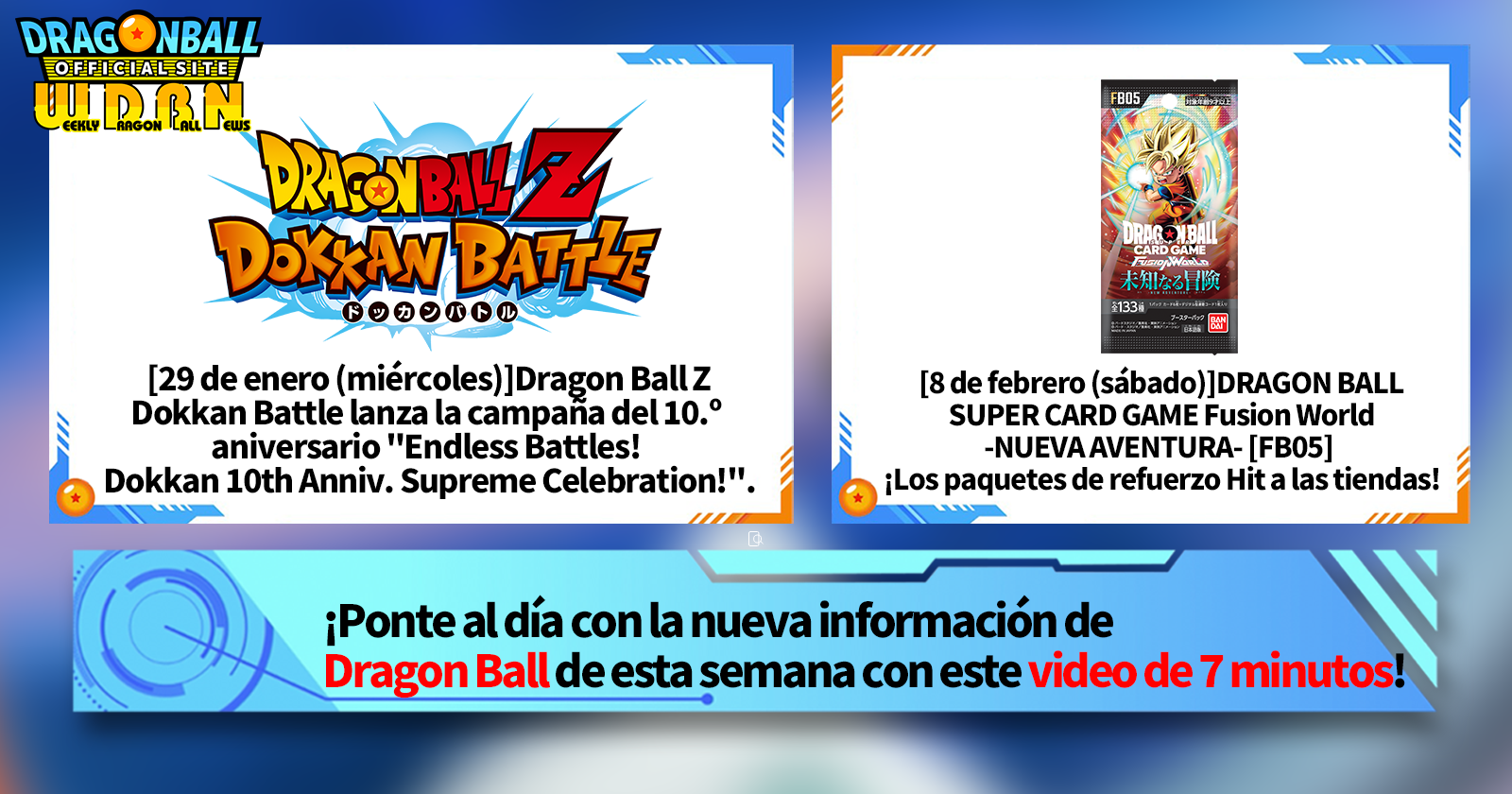 "Noticias semanales de Dragon Ball" es una serie de videos que se actualiza todos los lunes (JST) para brindarte las últimas noticias del mundo de Dragon Ball. ¡Únete al editor de V Jump, Victor Uchida, mientras cubre toda la información más reciente publicada la semana anterior, así como actualizaciones nuevas como información sobre nuevos productos y noticias del sitio para la semana que viene!