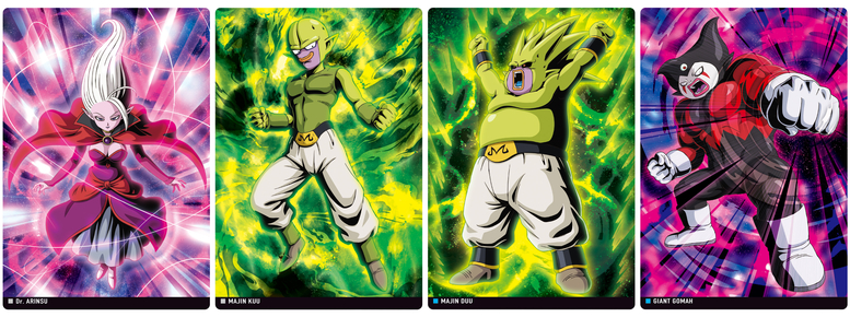 ¡Los guerreros que lucharon valientemente en las etapas finales del arco de Majin Buu están aquí como cartas SR! ¡Los efectos dorados complementan brillantemente las ilustraciones de sus movimientos!