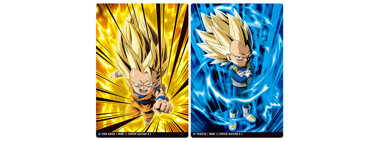 ¡Super Saiyan 4 Goku (Mini) será una carta SR (Super Rara) con un efecto dorado brillante! ¡Super Saiyan 3 Vegeta será una carta holográfica SSR (Super Especial Rara) súper llamativa!