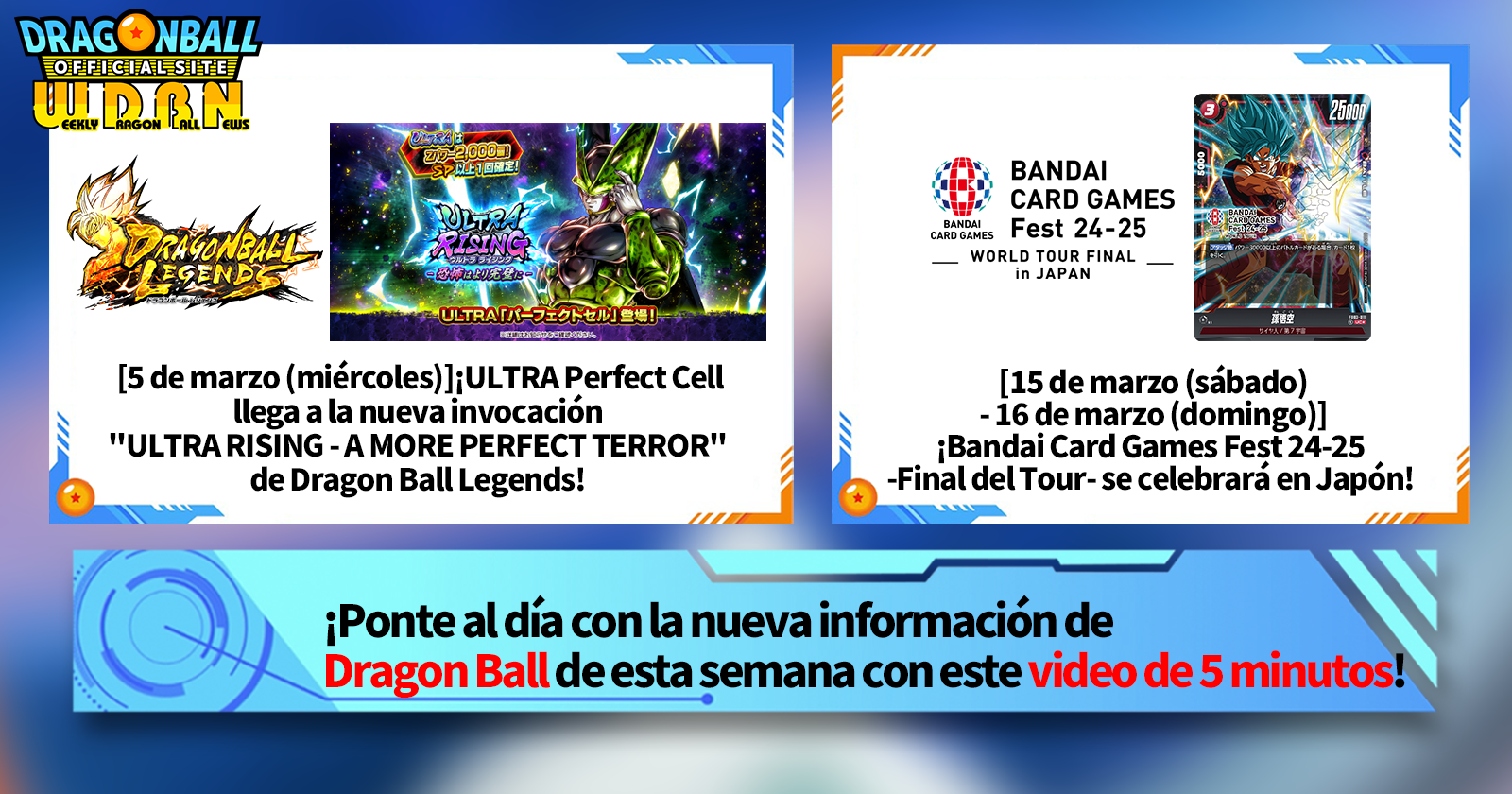 "Noticias semanales de Dragon Ball" es una serie de videos que se actualiza todos los lunes (JST) para brindarte las últimas noticias del mundo de Dragon Ball. ¡Únete al editor de V Jump, Victor Uchida, mientras cubre toda la información más reciente publicada la semana anterior, así como actualizaciones nuevas como información sobre nuevos productos y noticias del sitio para la semana que viene!