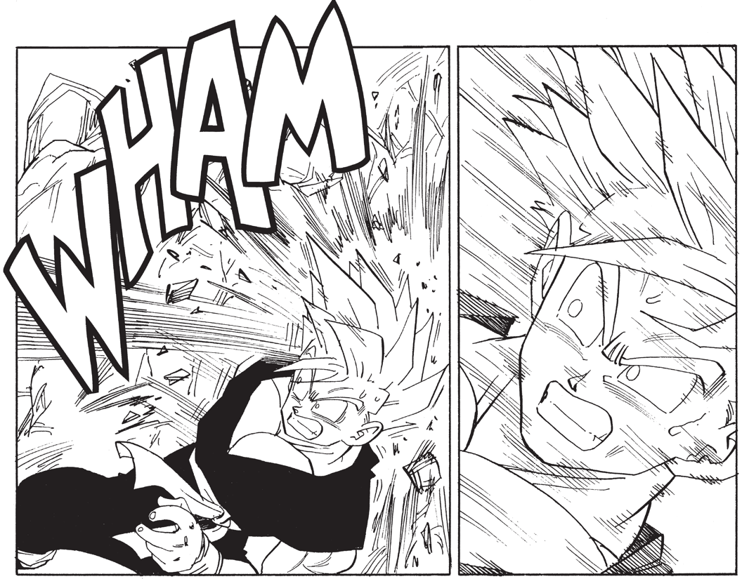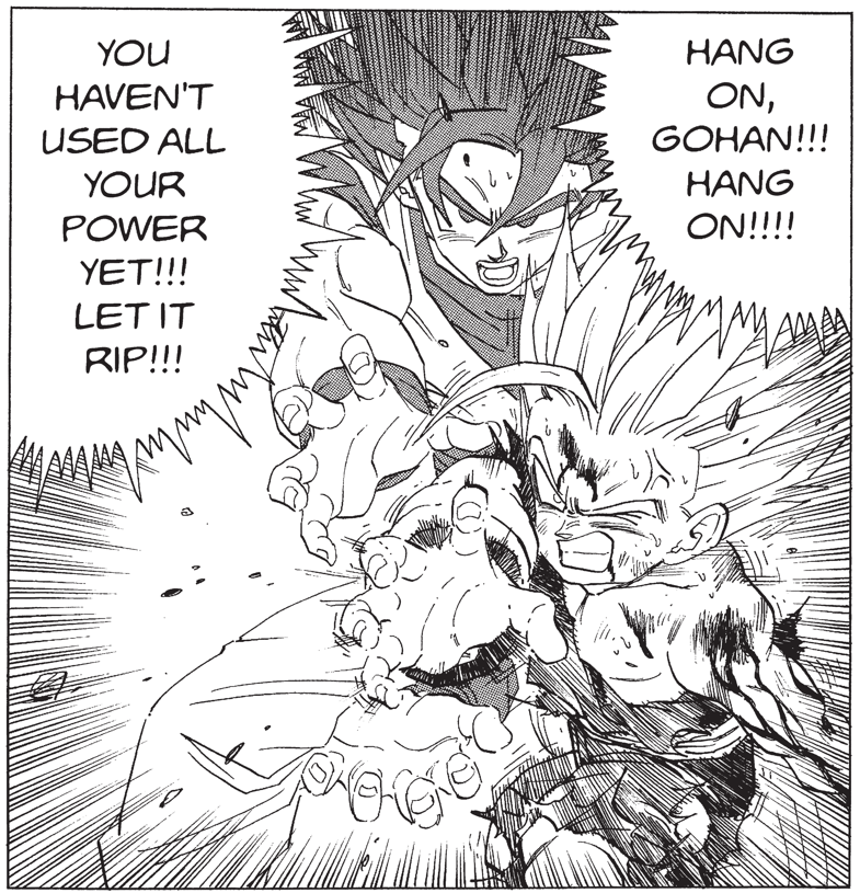 Shupei: Y también, la escena del Kamehameha padre-hijo. La escena donde Goku aparece detrás de Gohan, quien grita. Como Goku está muerto, ahora depende de Gohan derrotar a Cell.