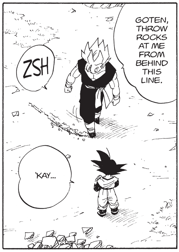 Shoinji: Sí. Me gustan todos los personajes, no solo Tenshinhan. Me gustó la parte donde Trunks y Goten se convierten en Super Saiyans tan fácilmente. También, la escena donde Gohan le dice a Goten que se pare en la línea que dibujó en el suelo y que le tire piedras. Goten las tira tan rápido que Gohan se ve obligado a dibujar otra línea más lejos. Esos pequeños momentos de paz son geniales. También me encantó la escena del anime donde Piccolo conduce un coche (risas).