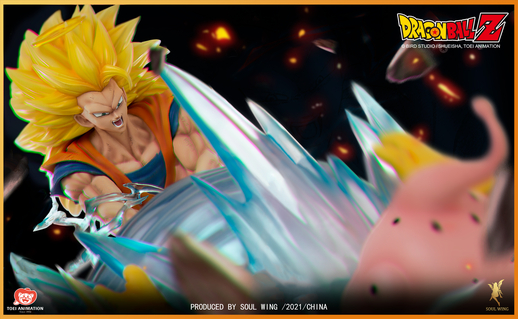 Este último lanzamiento exclusivo de China de la etiqueta de figura de estatua "SOUL WING" ve a Super Saiyan 3 Goku en una batalla culminante contra Majin Buu.
