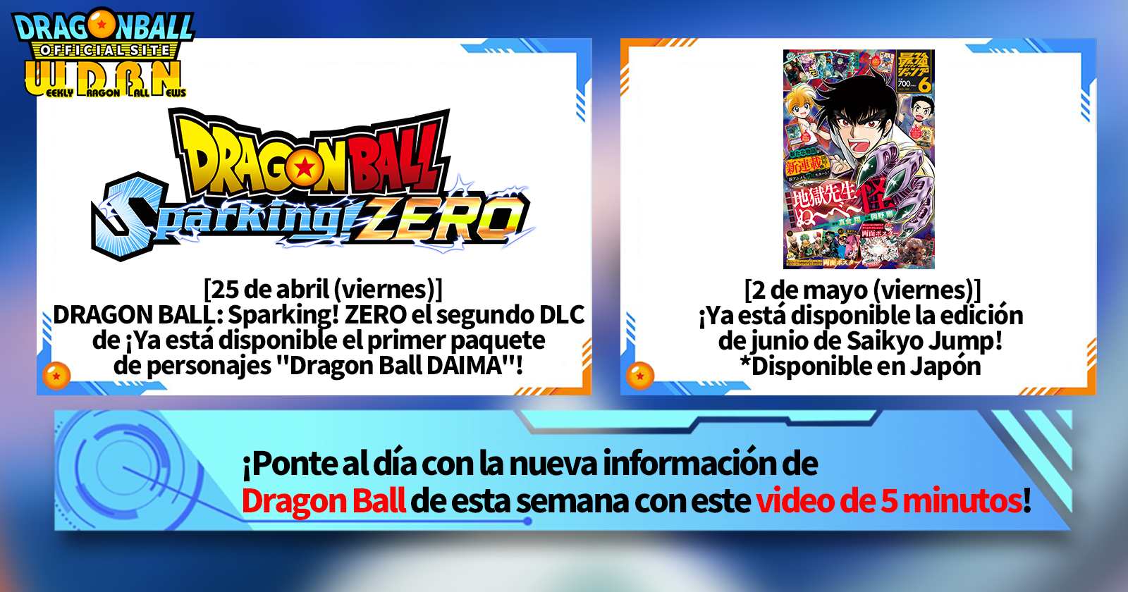 "Noticias semanales de Dragon Ball" es una serie de videos que se actualiza cada lunes (JST) para ofrecerte las últimas noticias del mundo de Dragon Ball. ¡Únete al editor de V Jump, Victory Uchida, quien cubre las últimas novedades de la semana anterior, además de novedades como información sobre nuevos productos y noticias del sitio web para la próxima semana!