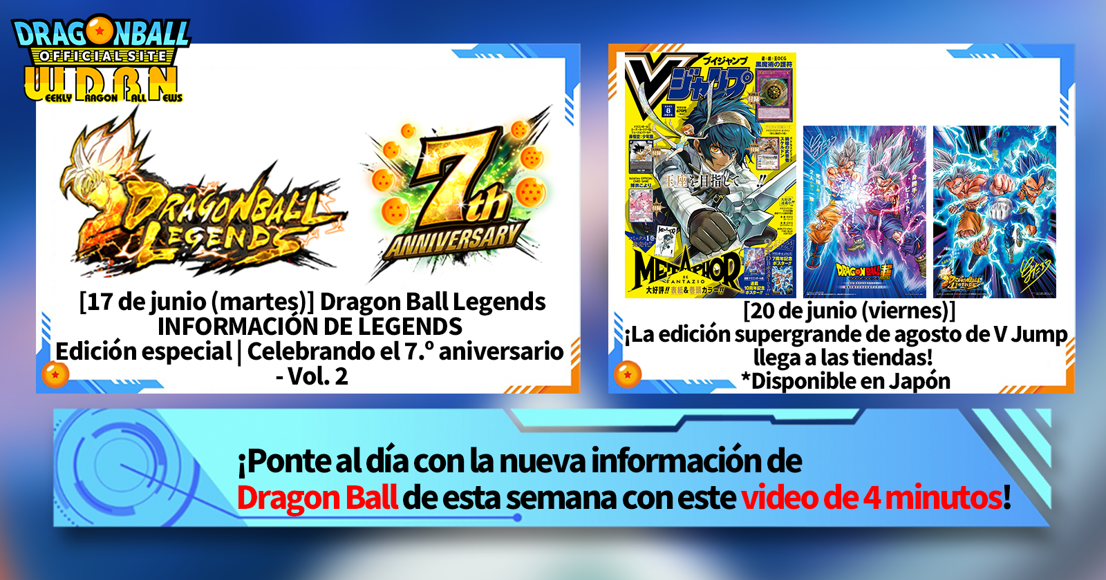"Noticias semanales de Dragon Ball" es una serie de videos que se actualiza cada lunes (JST) para ofrecerte las últimas noticias del mundo de Dragon Ball. ¡Únete al editor de V Jump, Victory Uchida, quien cubre las últimas novedades de la semana anterior, además de novedades como información sobre nuevos productos y noticias del sitio web para la próxima semana!