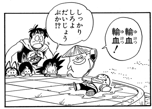 El Usher Fantasma le da una transfusión de sangre a Krillin después de que su sangre es succionada por el guerrero de la Fortuneteller Baba, Draculaman.