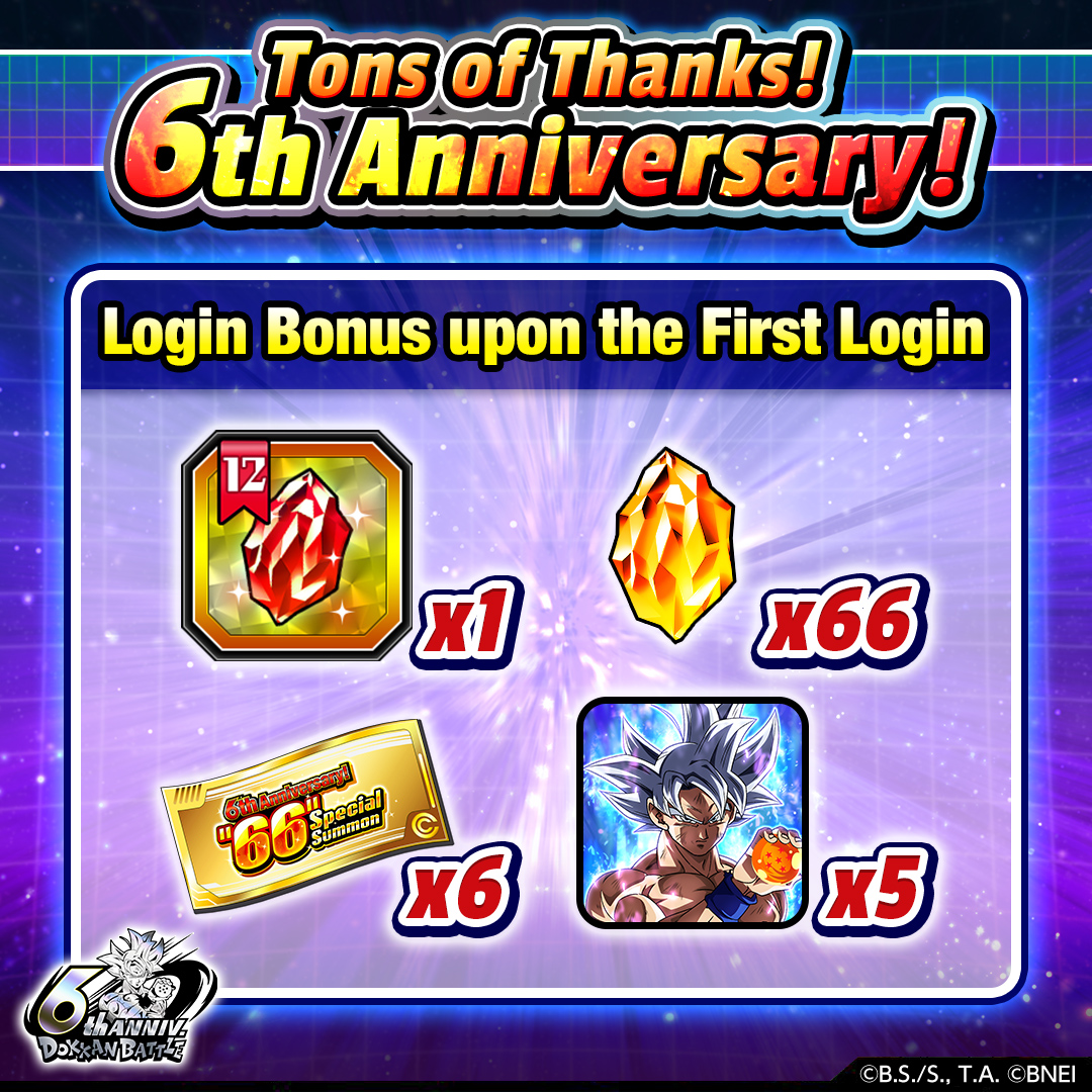 Además, el "6º aniversario! '66' Invocación especial", que te da la oportunidad de agregar 66 personajes a tu squad al completar las misiones, y el "¡6º aniversario! '66' Invocación especial por boleto", con el que se puede jugar ¡Los boletos obtenidos del bono de inicio de sesión también están disponibles ahora! Para aquellos que aún no se han sumado a la acción de la Dokkan Battle , estos increíbles eventos los pondrán al día con otros jugadores en poco tiempo, ¡así que no hay mejor momento para sumergirse que ahora! ¡Consulta dentro del juego para obtener más detalles y más información sobre el evento!