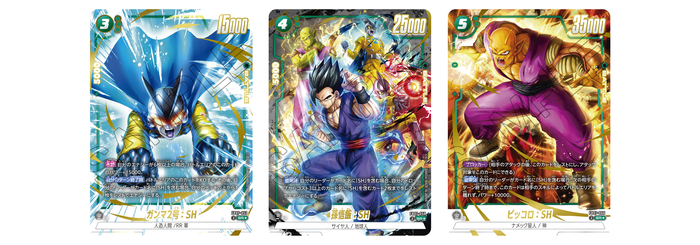Las cartas SR Alt-Art "Verdes" son "Gamma 2: SH", "Son Gohan: SH" y "Piccolo: SH", todos luchadores clave de la película Dragon Ball Super: SUPER HERO . La ilustración de "Son Gohan: SH" presenta a Piccolo después de que Shenron desbloquee su potencial, además del audaz dúo androide, ¡lo que la convierte en una visita obligada para cualquier fan de la película! ¡Y eso no es todo! Esta carta también tiene una poderosa habilidad que te permitirá elegir hasta 2 cartas específicas de tu Drop y añadirlas a tu energía.