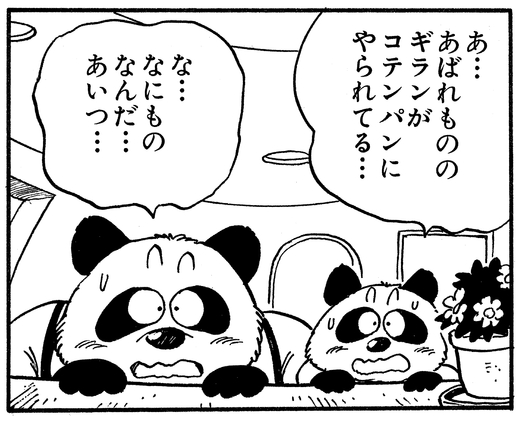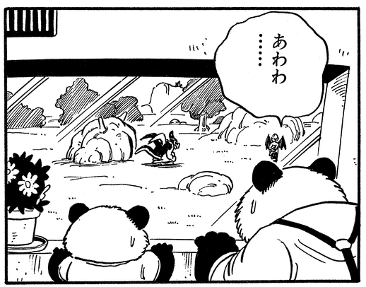 Desde su casa, la familia Panda observa conmocionada y temerosa cómo el alborotador rufián Giran es dominado sin esfuerzo.
