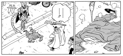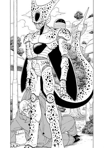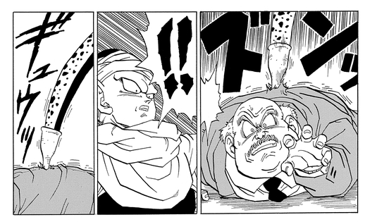 Justo cuando parece que ha sido liberado de las garras de Cell, el villano apuñala al hombre con su cola, absorbiendo toda su energía en el proceso.
