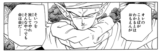 Mientras le suplica ayuda a Piccolo, sigue actuando como un tonto arrogante, gritando: "¡Oye! ¿Me estás escuchando?". Sorprendido por la interacción, Piccolo, desconcertado, admite: "Una vida es una vida, incluso una tan inútil como esta".