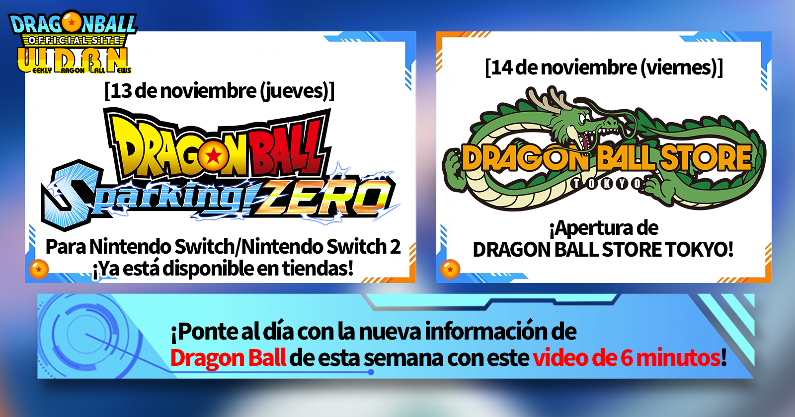 "Noticias semanales de Dragon Ball" es una serie de videos que se actualiza todos los lunes (hora estándar de Japón) para traerte las últimas noticias del mundo de Dragon Ball. Acompaña al editor de V Jump , Victory Uchida, mientras repasa la información más relevante de la semana anterior, así como las novedades, como información sobre nuevos productos y noticias del sitio para la semana siguiente.