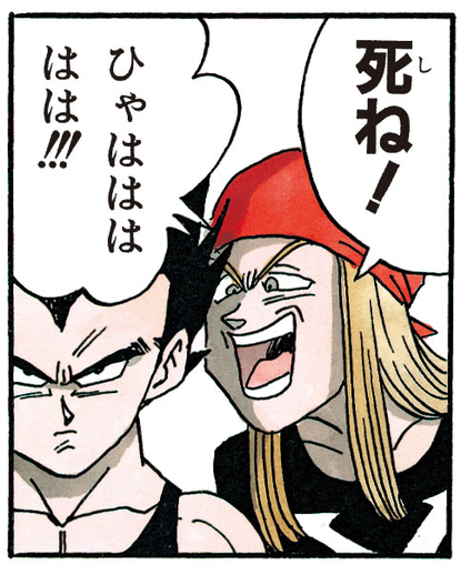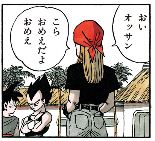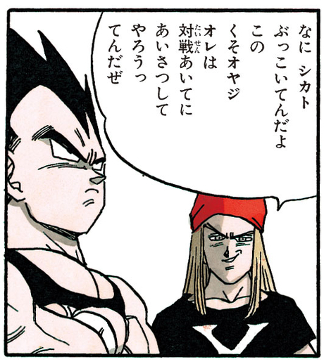 El joven luchador saluda a Vegeta con un despectivo "¡Eh, tío!", pero el Saiyan ni siquiera lo mira. Ante esto, se enfurece: "¿Te crees muy bueno? ¡Te estoy hablando a ti!". Y, en un intento por provocar a su oponente, se le planta cara a cara, burlándose de él con un "¡Ja! ¡Vas a caer, tío!".