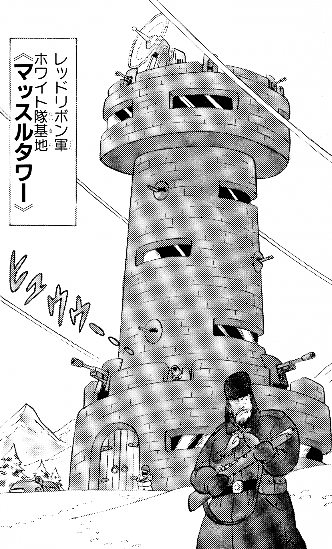 Muscle Tower cierne sobre Jingle Village cubierto de nieve y sirve como base para el General White del Red Ribbon Army. Tiene seis pisos de altura y cada piso es atendido por uno de los subordinados del General White, incluidos el Major Metallic y el Sergeant Murasaki. Con la habitación del cuarto piso del sargento Murasaki con un jardín interior de estilo japonés con árboles y un estanque, mientras que el quinto piso esconde una habitación secreta donde vive el monstruo Buyon , ¡la diversidad es uno de los sellos distintivos de esta torre! Muscle Tower es también el lugar donde Goku conoció y se hizo amigo del bondadoso Android 8, a quien más tarde llamó Hatchan. Hatchan pasó a vivir en Jingle Village después de que Muscle Tower fuera destruida.