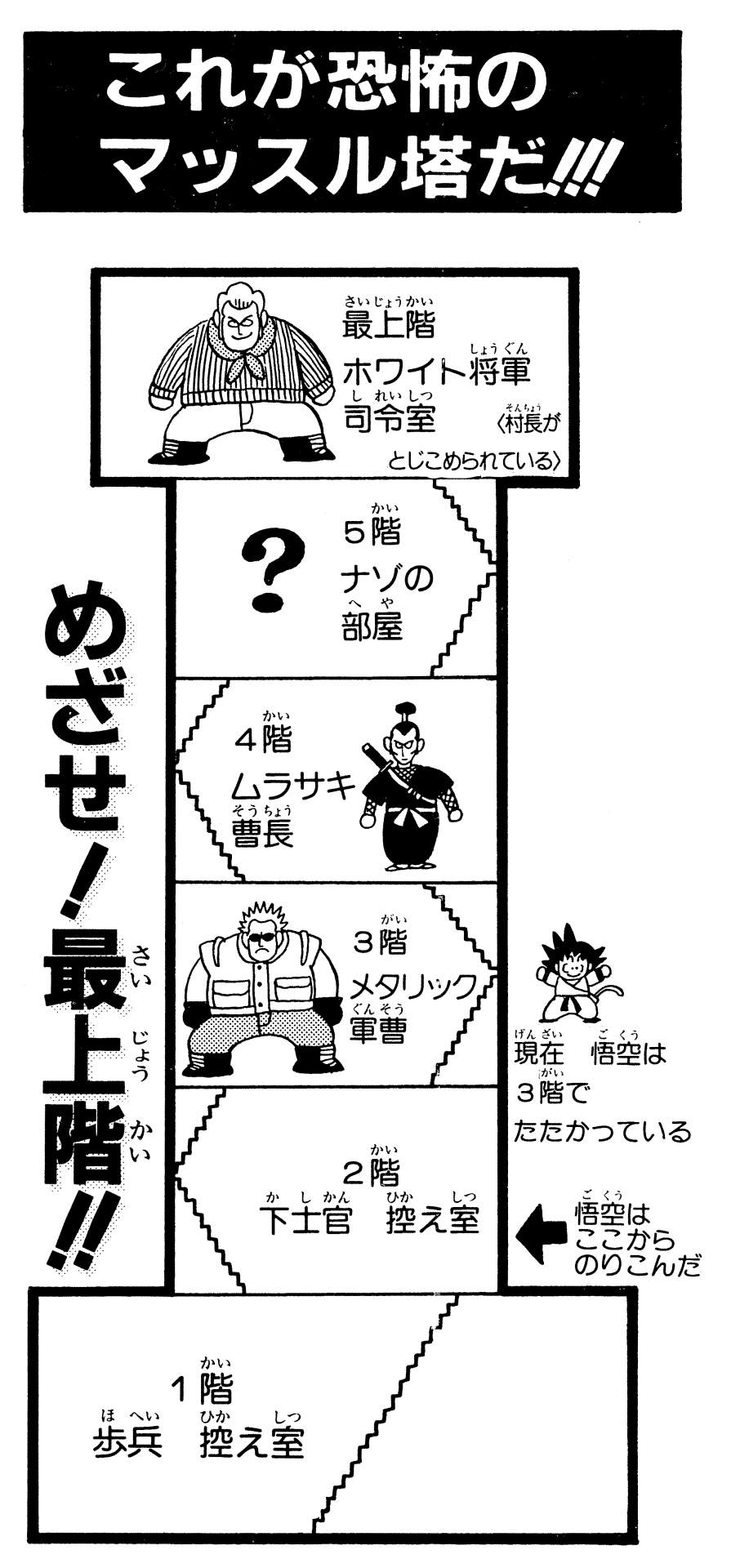 Goku se infiltró en Muscle Tower para liberar al alcalde de Jingle Village, que estaba cautivo.