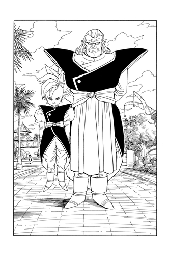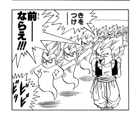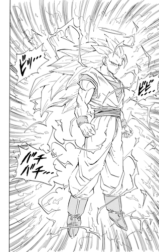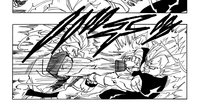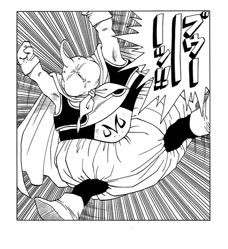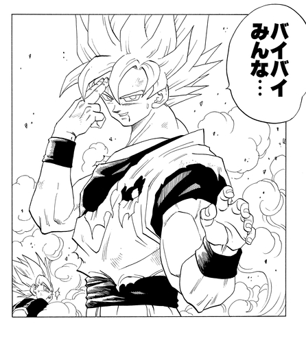 Vegeta regresa de Another World y él y Goku usan los Pendientes Potara para fusionarse en el increíblemente poderoso Vegito. Este logra asestarle una paliza a Super Buu , y luego entra en el cuerpo de Buu y rescata a los guerreros que Buu había absorbido. Como resultado, Majin Buu (Good) se separa y regresa a su forma original y pura, y comienza una batalla por el destino del universo entre Goku y Majin Buu (Pure) en el Supreme Kai's Realm. El panel inferior muestra el fatídico momento en que su duelo llega a su fin.