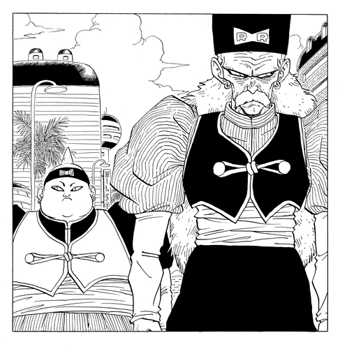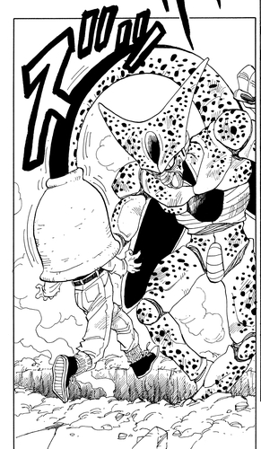 El nombre del recién llegado es Cell, un androide creado en el futuro por una supercomputadora propiedad del científico del Red Ribbon Army, el Dr. Gero, a partir de células tomadas de Goku, Piccolo, Frieza y otros. Habiendo viajado al pasado en una máquina del tiempo para absorber a los Androides 17 y 18 y alcanzar su Perfect Form, Cell primero drena la fuerza vital de varios humanos sacrificados, lo que le otorga un poder que supera al de los Kami y Piccolo fusionados. Durante la pelea con el Android 16, Cell se decide por su próximo objetivo: el Android 17. El panel a continuación representa el momento en que el Android 17 baja la guardia, lo que le da a Cell una oportunidad para hacer su movimiento.